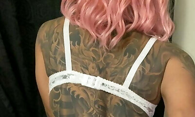 blonde tatouée avec des seins innés se faisant défoncer le cul avec des jouets