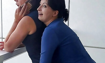 Rude ginger-haired boss takes advantage of her submissive lesbian employee by ramming her with a strap on dildo