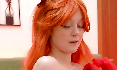 Sexy redhead babe Eva Barbie plays with a sex toy on the bed.